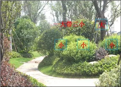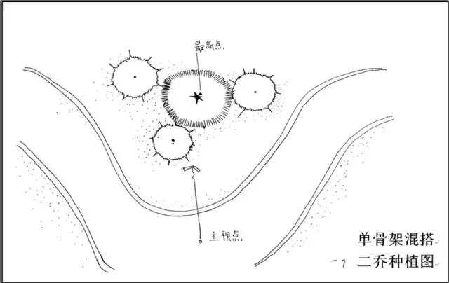 定位技巧:选取坡地高点种植单棵骨架乔木,其体量要明显大于二乔,结合实际在其外围使用V字型或C字型搭配二乔。