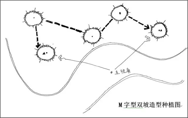 定位技巧:先定点主视角线上的第一棵,再定主视角近端一棵,最后是远端。角度根据坡型适当平行打开,避免直角、等边。主视角前方选择矮胖型植株(红色虚线为可参照的林缘线条)。