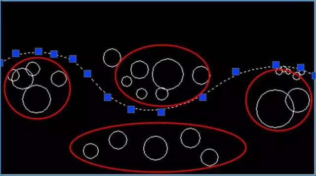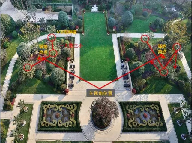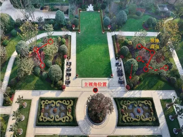 定点技巧:中间高点选择最大棵,因为是中间放空留草皮的做法,所以在地被线的大小头处(图中较大红圈位置)配置外围两棵,从这里可以看出,M型双坡种植是对M型单坡种植在更广度空间上的一个应用。