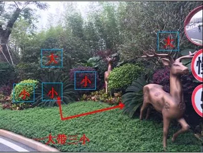 ❹在无参照物时,可以先种一棵大球作为石头参考,以此定位,位置选主视角线上,景观突出点或弱点。