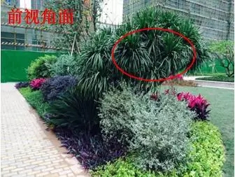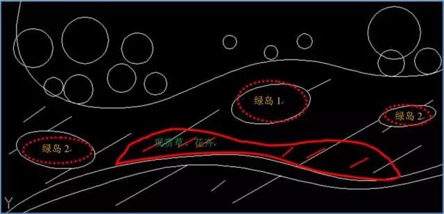 在部分节点位置选择将观赏度高的植物跳出来单独运用,能够打破组团线条和框架的限制,产生耳目一新的效果,但组团(黄线)与孤植(红圈)分隔应更清晰。