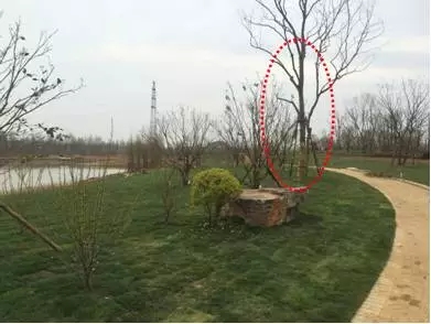 红圈位置是两处主要视线的结合点,黄色虚线为游人视线方向,红色虚线是林缘与道路的距离,散点树与背后组团要保持较好的空间距离,感官上相互独立界限清晰。