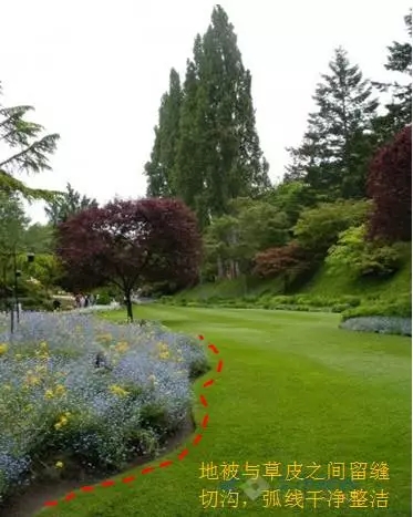 ❺包边地被向下倾斜顺坡种植,优先种植外缘线条,由外向内倾斜角度递减,种植时对苗木大小进行甄选,遵循前矮后高种植原则。