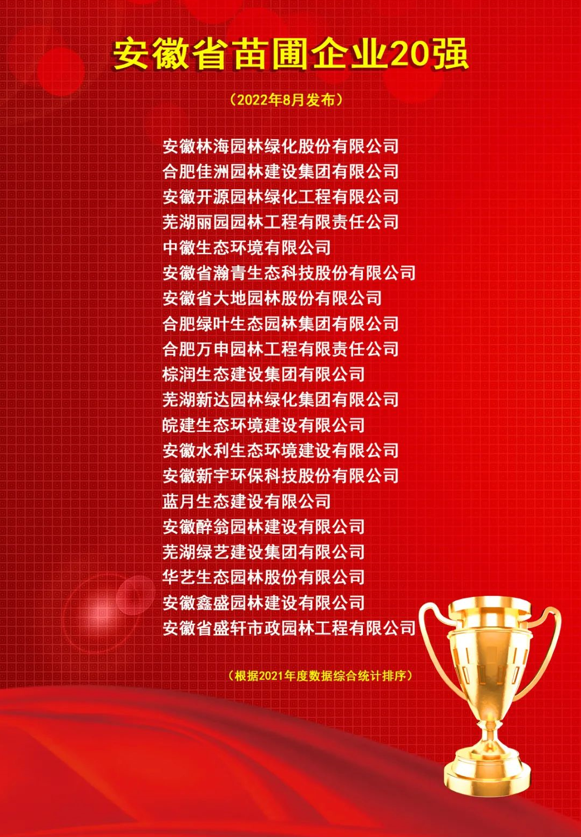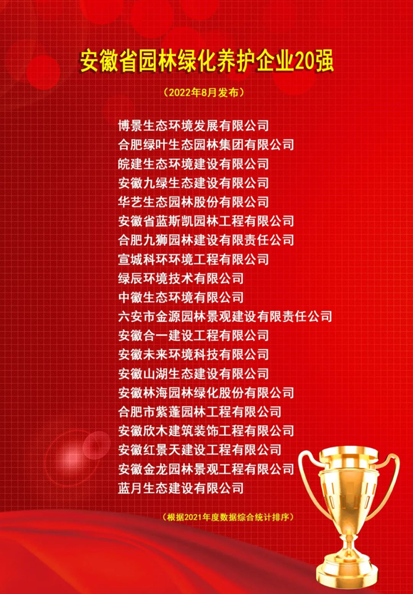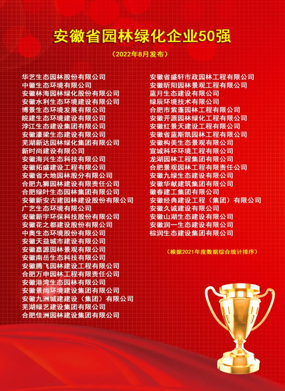 日前,安徽省风景园林行业协会公布了2022年安徽省园林绿化行业评比表彰活动入选优秀单位和个人名单,中徽生态凭借强劲实力和不俗业绩,分别在“省园林绿化企业50强”、“省园林绿化养护企业20强”、“省苗圃企业20强”三个重量级榜单上位列前茅,并取得了综合业绩第二名的好成绩。