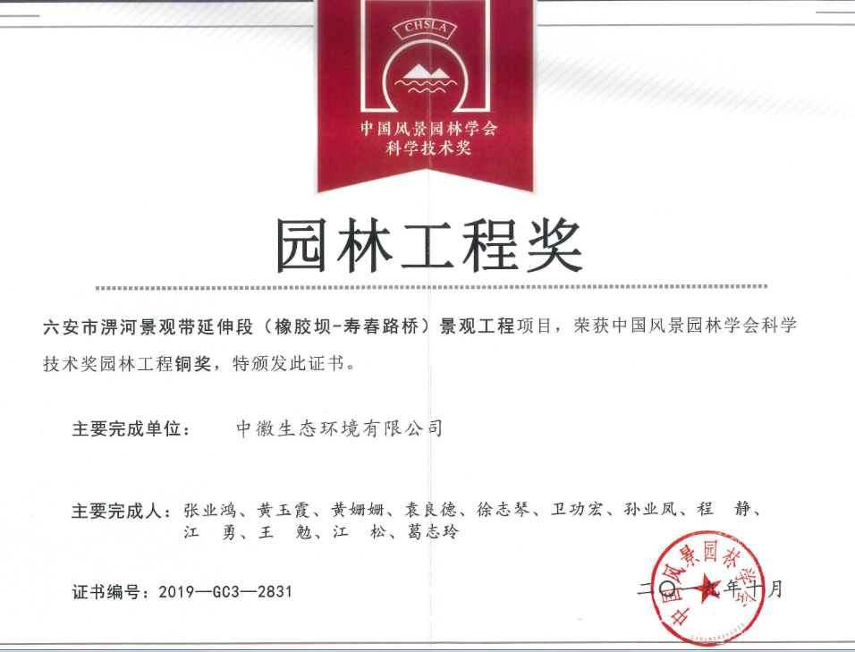 中徽风景园林学会为鼓励风景园林科研院所、大专院校、企事业单位以及社会各界对风景园林领域的科技投入,调动广大科技人员的积极性和创造性,提高规划设计、工程施工技术和行业整体科技水平,提高行业科技创新能力,加快科技成果转化,开展了2019年度科学技术奖的征集及评审工作。我leyu乐鱼·官方web站登录入口“六安市淠河景观带延伸段(橡胶坝-寿春路桥)景观工程”项目,在1035份申报材料中脱颖而出,荣获中国风景园林学会科学技术奖园林工程奖铜奖。本次会议期间颁发了此项奖项。