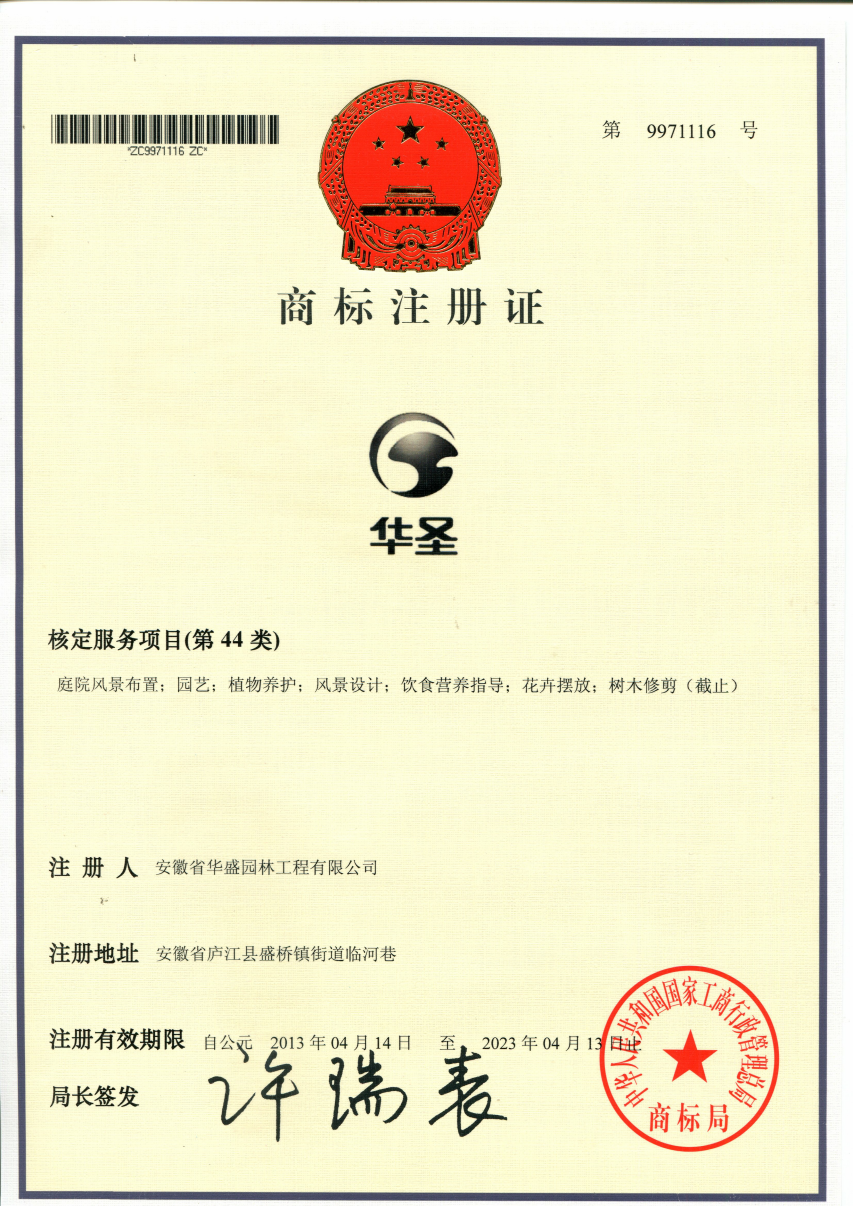 牌商标设计的基本含义是:(1)中徽园林leyu乐鱼·官方web站登录入口的前身为安徽华盛园林工程leyu乐鱼·官方web站登录入口,注册地为庐江县盛桥镇。苗木养护和景观设计均为leyu乐鱼·官方web站登录入口的主导产业。(2)安徽黄山是世界三遗产地(即自然、文化遗产和世界地质公园),迎客松是安徽代表性标识;将华盛园林“盛”字的拼音首字母“S”抽象成迎客松形象,旨在突出企业的名称、地域性和发展使命。(3)圆形象征着地球,加上“华圣”两个汉字构成商标,隐喻leyu乐鱼·官方web站登录入口立足安徽走向世界的美好愿景,象征着企业立足于安徽,面向全国,弘扬爱国、进取、竞争、和谐、勤俭的徽商精神和热情、拼搏、顽强、坚韧、博大的迎客松精神,争创国内一流企业,实现为生态大地扮绿、为美丽中国添彩的执着追求。