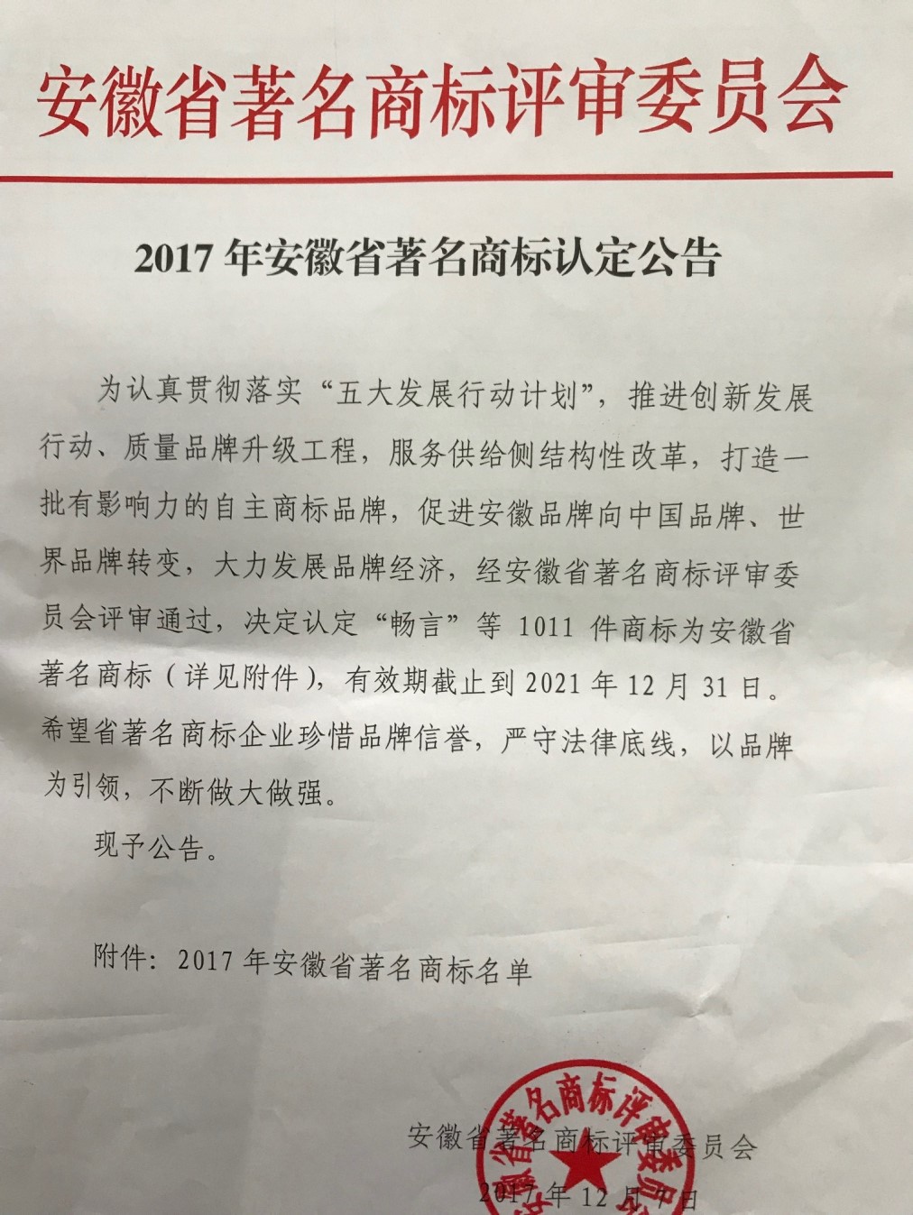 2017年12月17 日,安徽省著名商标评审委员会公告:我leyu乐鱼·官方web站登录入口申报的
