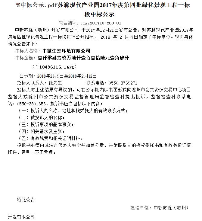 leyu乐鱼·官方web站登录入口中标“苏滁现代产业园2017年度第四批景观绿化工程一标段”项目