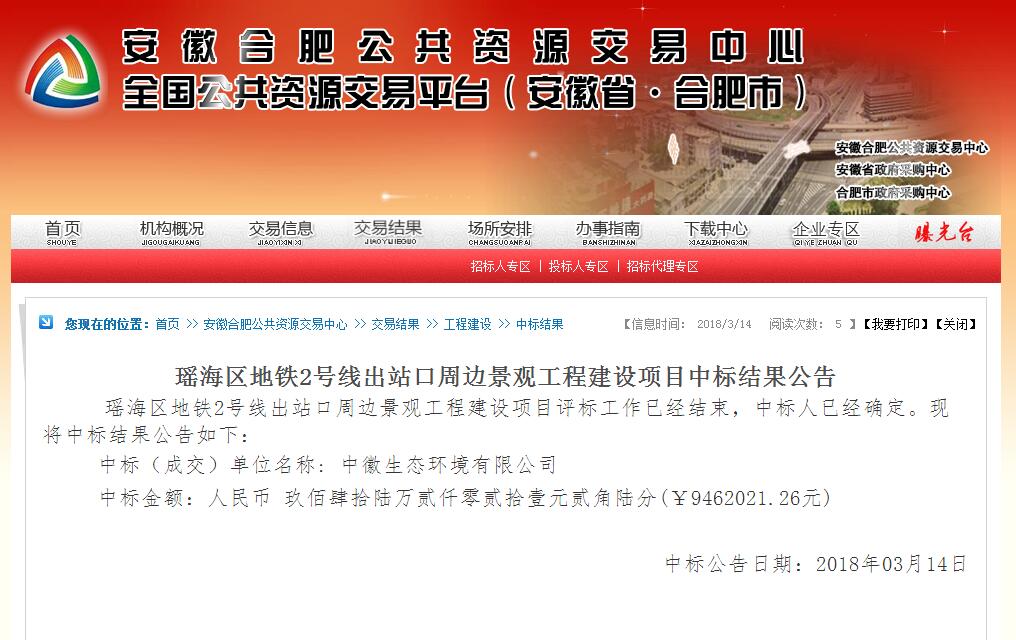 2018年3月14日,leyu乐鱼·官方web站登录入口中标“瑶海区地铁2号线出站口周边景观工程建设项目”。