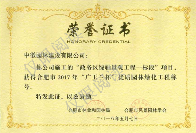 2018年5月7日,市林业和园林局、市风景园林学会对申报2017年度 “广玉兰杯”优质园林绿化项目经过资料初审、复审和现场核查三个阶段的综合评定,我leyu乐鱼·官方web站登录入口“政务区绿轴景观工程一标段”项目荣获2017年度合肥市“广玉兰杯”优质园林绿化项目奖。