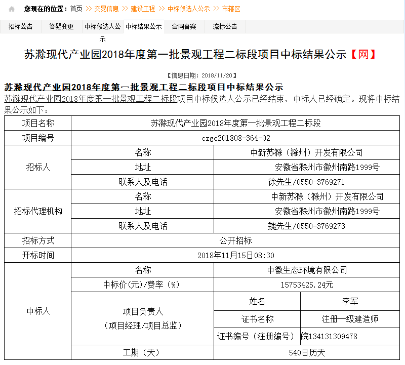2018年11月20日,leyu乐鱼·官方web站登录入口中标“苏滁现代产业园2018年度第一批景观工程二标段”项目。