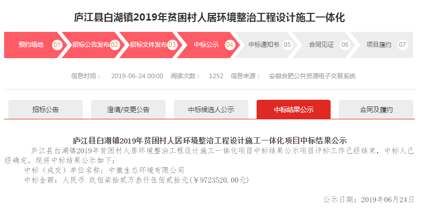 2019年6月24日,leyu乐鱼·官方web站登录入口中标“庐江县白湖镇2019年贫困村人居环境整治工程设计施工一体化项目”。