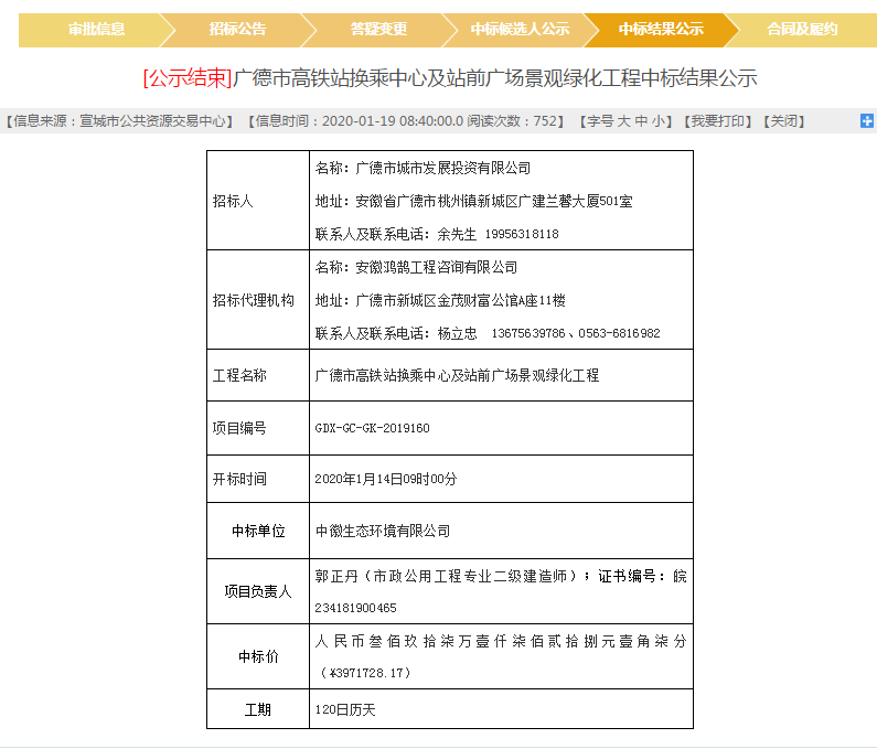 2020年1月19日,leyu乐鱼·官方web站登录入口中标“广德市高铁站换乘中心及站前广场景观绿化工程”项目。